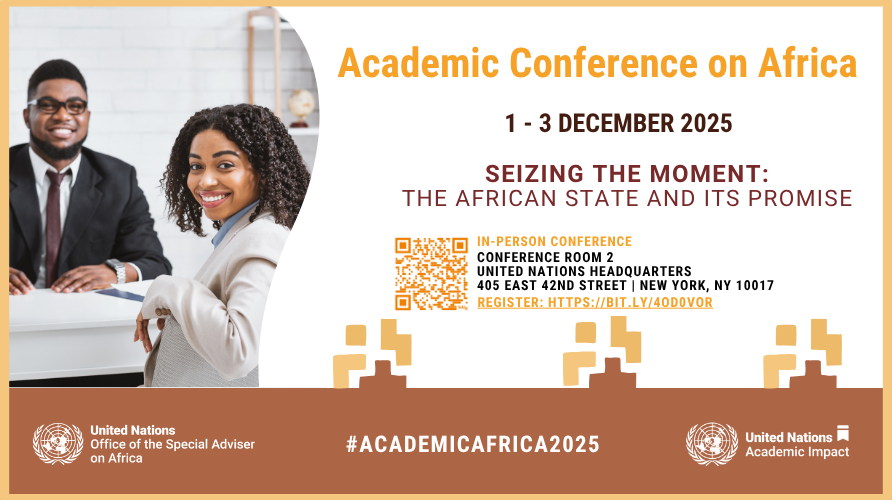 We are pleased to invite civil society —alongside African academics, UN colleagues, the African Diaspora, people of African descent, and all who are passionate about Africa—to the 2025 Academic Conference on Africa, taking place 1–3 December 2025 at UN Headquarters in New York. Under the theme “Seizing the Moment: The African State and Its Promise,” the conference brings together leading African thinkers and changemakers for a forward-looking dialogue on governance, development, and Africa’s policy future.