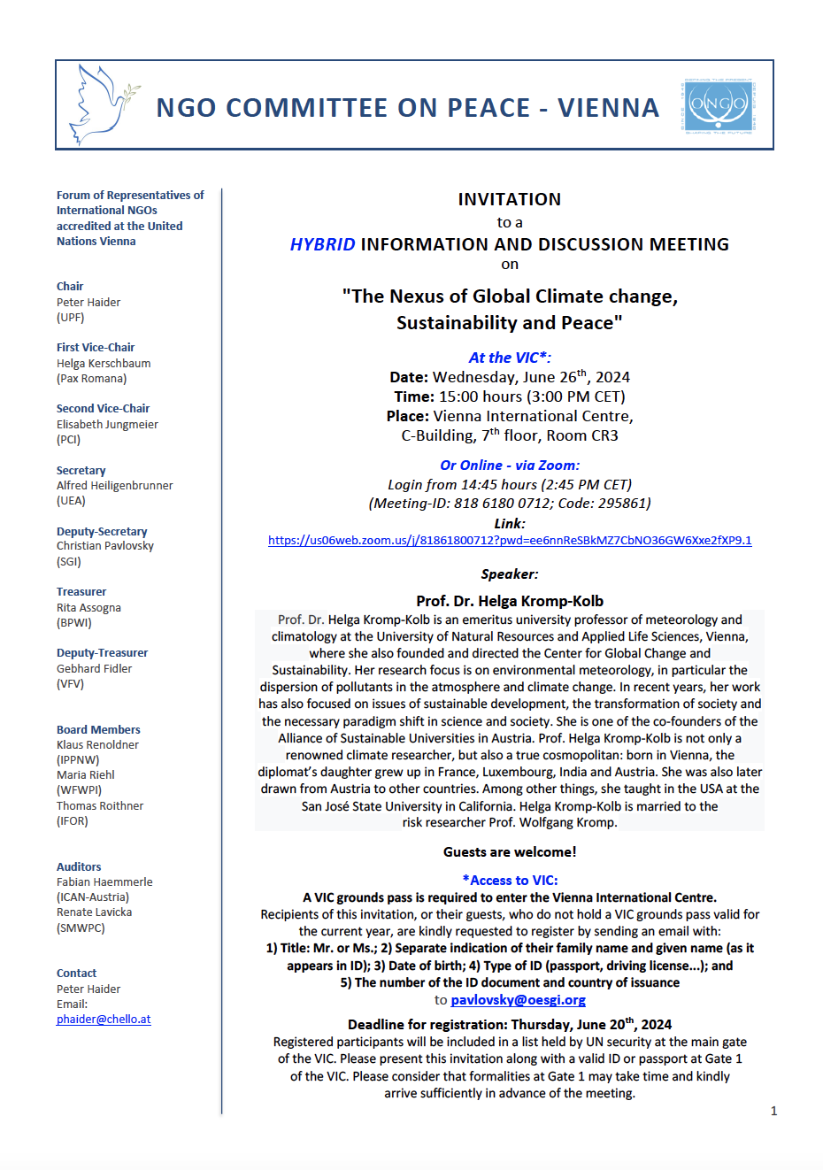 NGO COMMITTEE ON PEACE – VIENNA – HYBRID INFORMATION AND DISCUSSION MEETING on “The Nexus of Global Climate change, Sustainability and Peace”