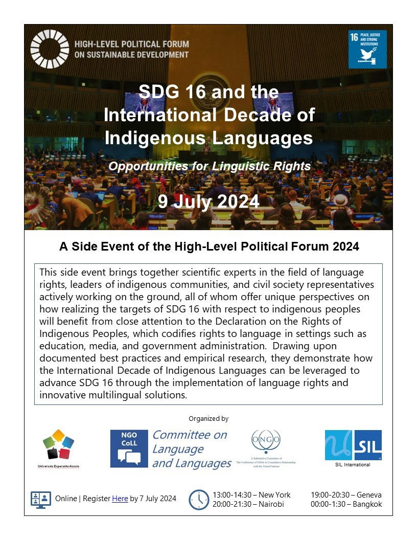 This side event brings together scientific experts in the field of language rights, leaders of indigenous communities, and civil society representatives actively working on the ground, all of whom offer unique perspectives on how realizing the targets of SDG 16 with respect to indigenous peoples will benefit from close attention to the Declaration on the Rights of Indigenous Peoples, which codifies rights to language in settings such as education, media, and government administration. Drawing upon documented best practices and empirical research, they demonstrate how the International Decade of Indigenous Languages (IDIL) can be leveraged to advance SDG 16 through the implementation of language rights and innovative multilingual solutions.