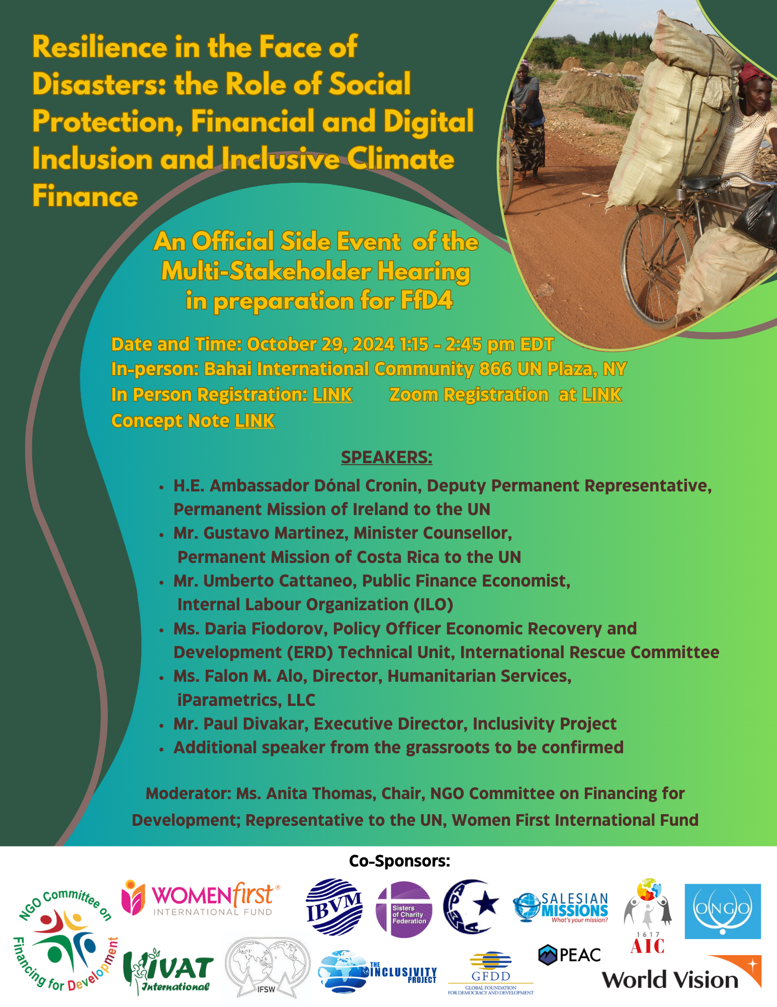 Resilience in the Face of Disasters: The Role of Social Protection, Financial and Digital Inclusion and Inclusive Climate Finance An Official Side Event of the Multi-Stakeholder Hearing in preparation for the Fourth International Conference on Financing for Development ? In-person: Baha'i International Community conference room, 866 UN Plaza, New York Please register by 5